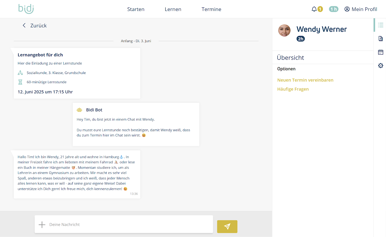 Deine Begrüßungsnachricht ist der erste Eindruck, den Schüler:innen (und oft auch ihre Eltern) von dir bekommen. Indem du eine Nachricht in deinem Profil hinterlegst, erhalten Schüler:innen deine Nachricht, sobald sie in einem Chat mit dir landen. Die Nachricht hilft dabei, Vertrauen aufzubauen und zeigt, wer du bist – ganz persönlich. 🧑🏫💬